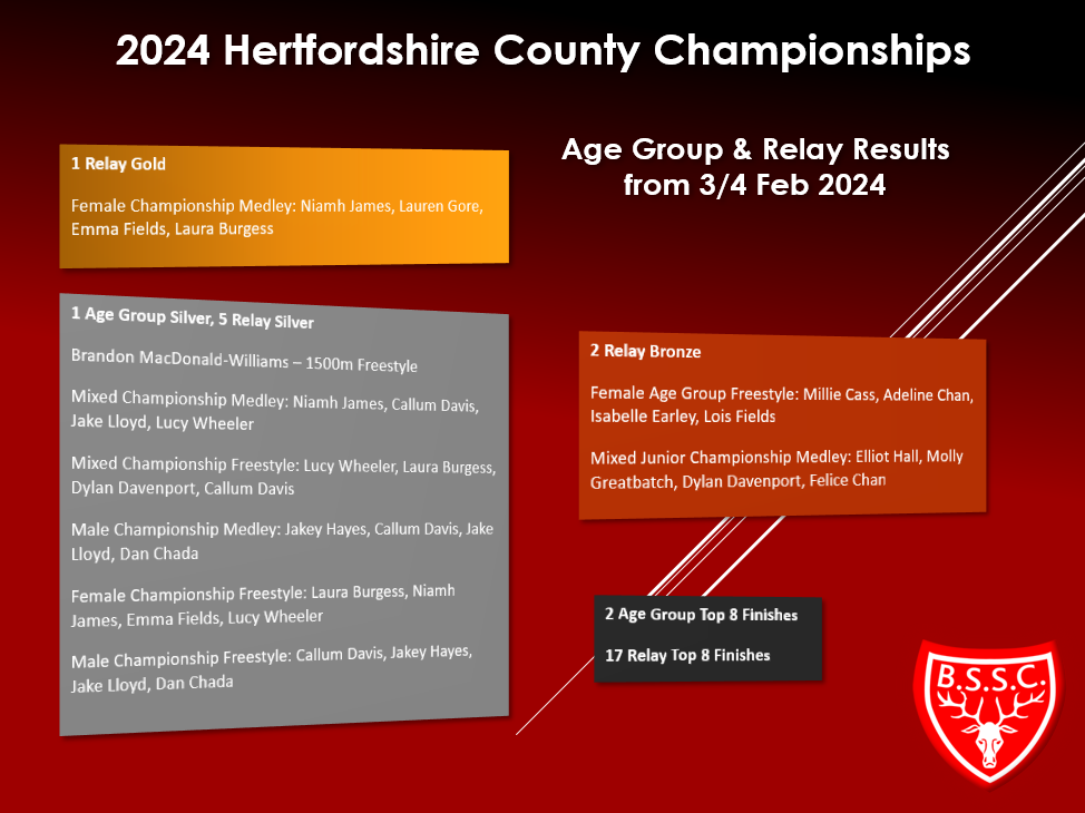 All six BSSC A relay teams in the youngest age group (13/Under) events finished in the top eight in the County (three 4th place finishes, one 5th and one 8th) and the female freestyle team of Millie Cass, Adeline Chan, Isabelle Earley and Lois Fields secured Bronze ahead of Royston by 0.01 seconds.